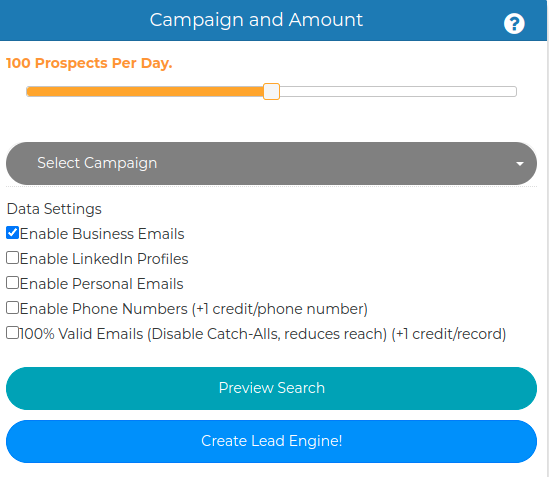 Then I select which Reply.io campaign I want the data to go into, how many leads I want each day, and what types of data I want like business email or phone numbers.