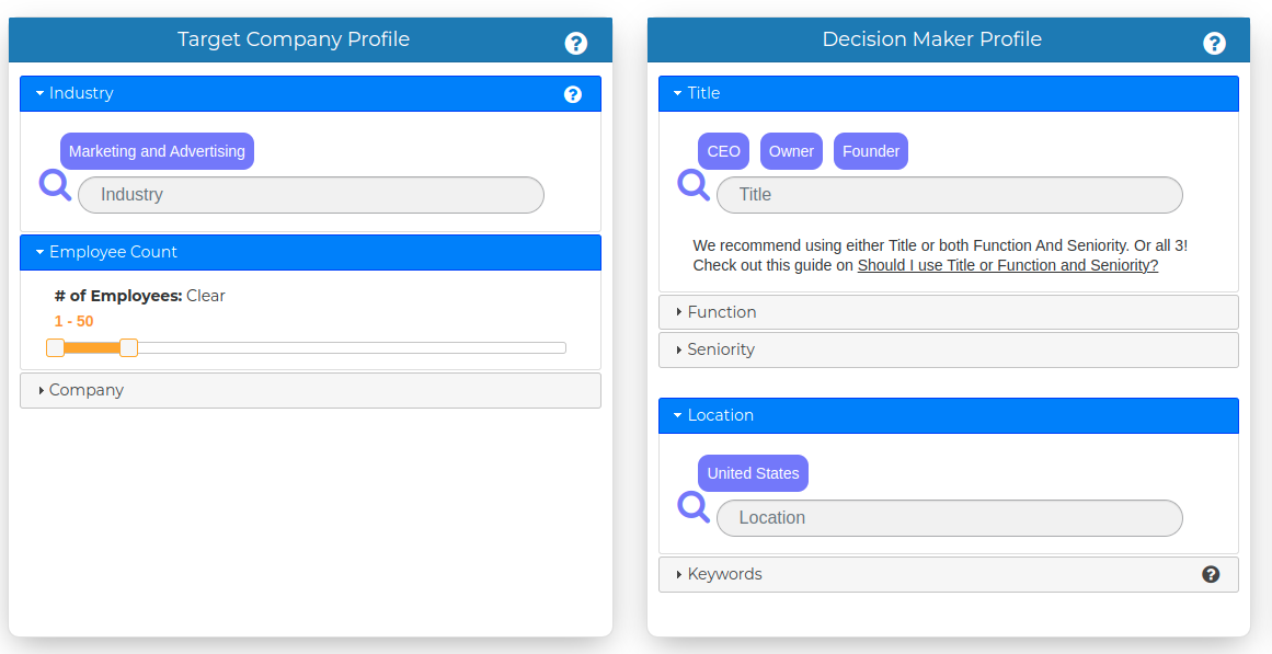 Simply set up a search for leads that look exactly like the client from your case study! In our case, that was small marketing agencies based in the USA.